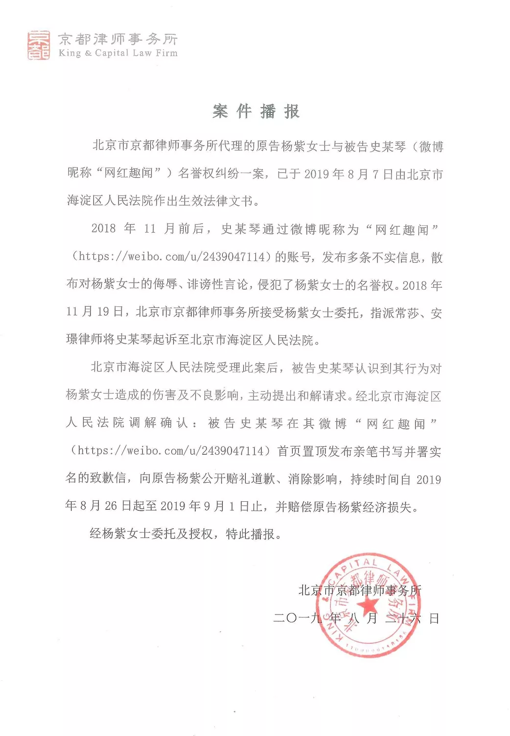 北京市京都律师事务所代理的原告杨紫女士与被告史某琴(微博账号“网红趣闻”)名誉权纠纷一案,已于2019年8月7日由北京市海淀区人民法院作出生效法律文书。史某琴承认其通过微博账号“网红趣闻”(weibo.com/u/2439047114),发布涉及杨紫女士的侮辱、诽谤性言论,侵犯了杨紫女士的名誉权。经北京市海淀区人民法院民事调解书确认,被告史某琴自2019年8月26日起至2019年9月1日止在微博账号“网红趣闻”首页置顶发布致歉信,并赔偿杨紫经济损失。