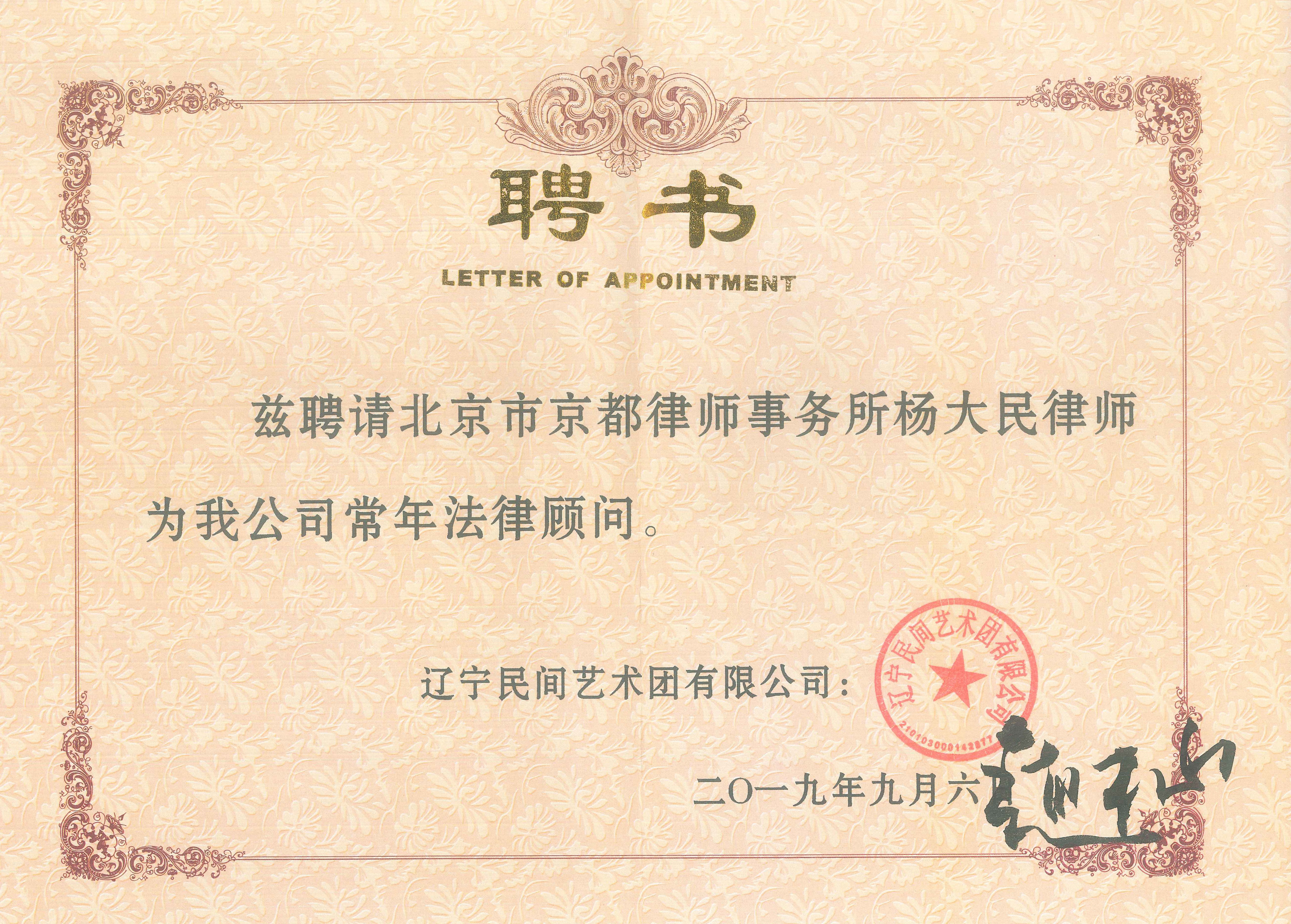 2019年9月6日下午,受著名表演艺术家赵本山先生的邀请,京都律师事务所名誉主任田文昌律师、高级合伙人杨大民律师飞往沈阳本山传媒,接受辽宁民间艺术团有限公司的聘任担任其常年法律顾问。